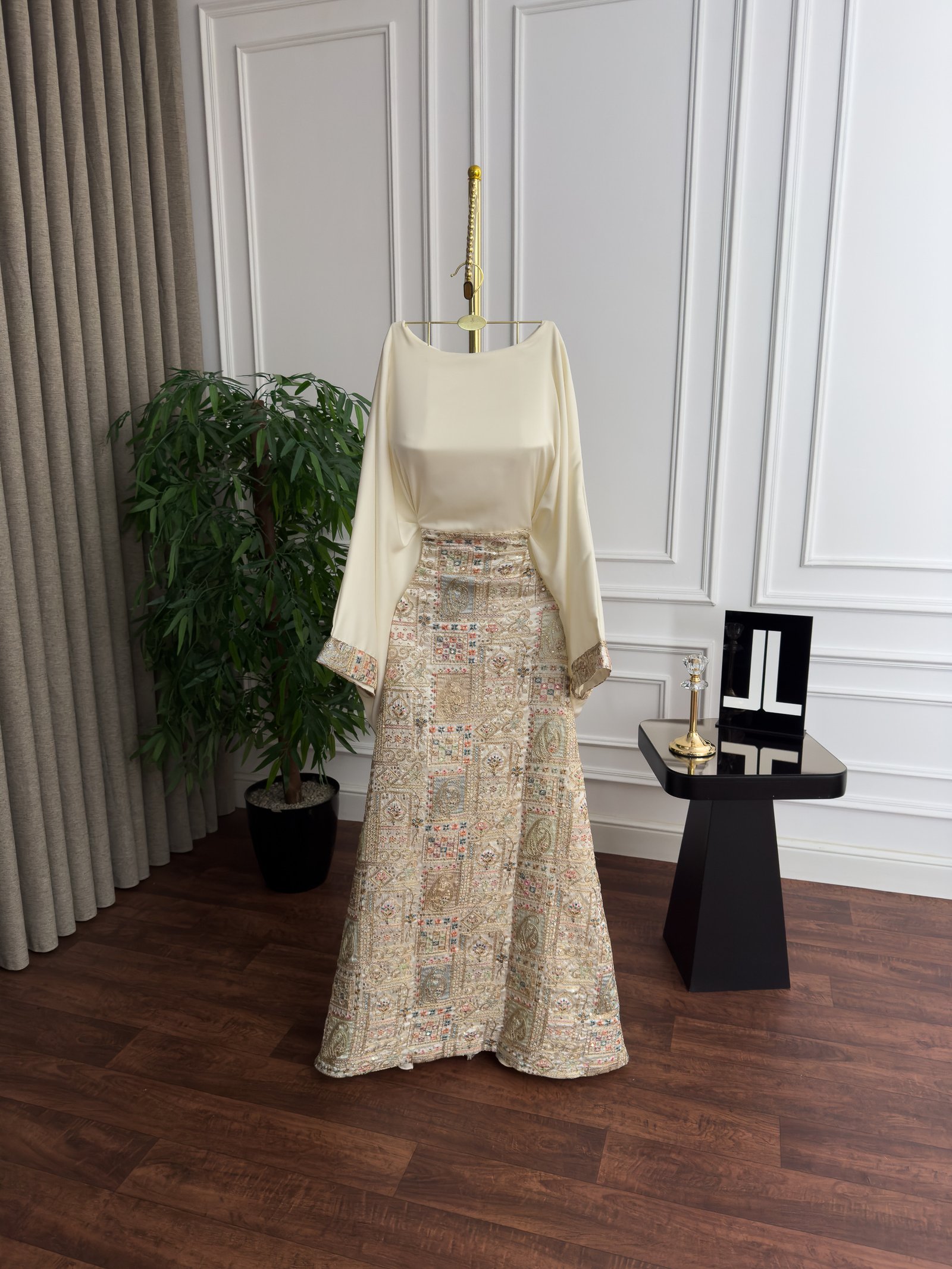 جيبة فستان أنيقة بتصميم مميز يجمع بين القماش الساتان والتطريز الفاخر، تمنحك إطلالة راقية وعصرية تناسب السهرات والمناسبات الخاصة