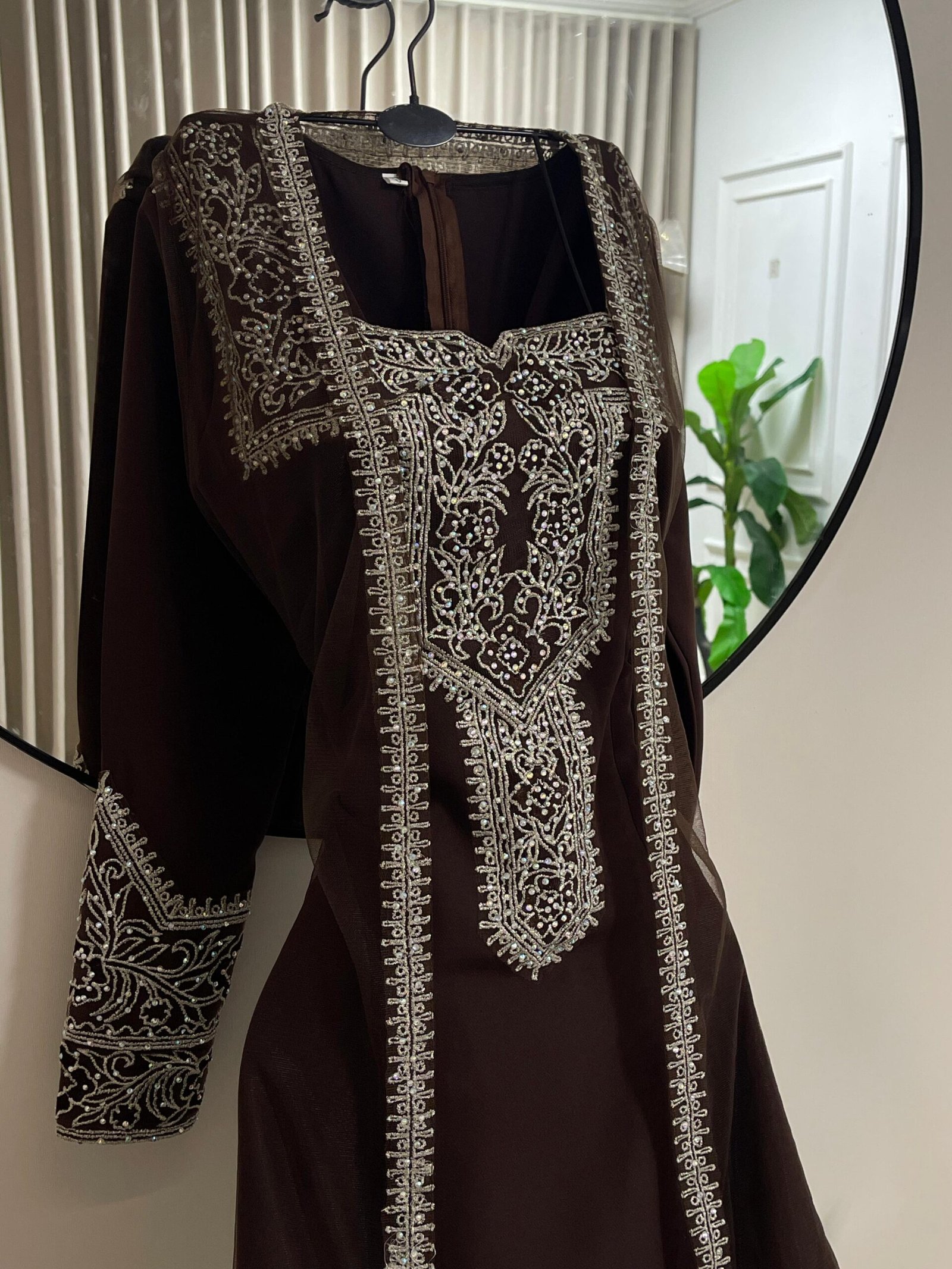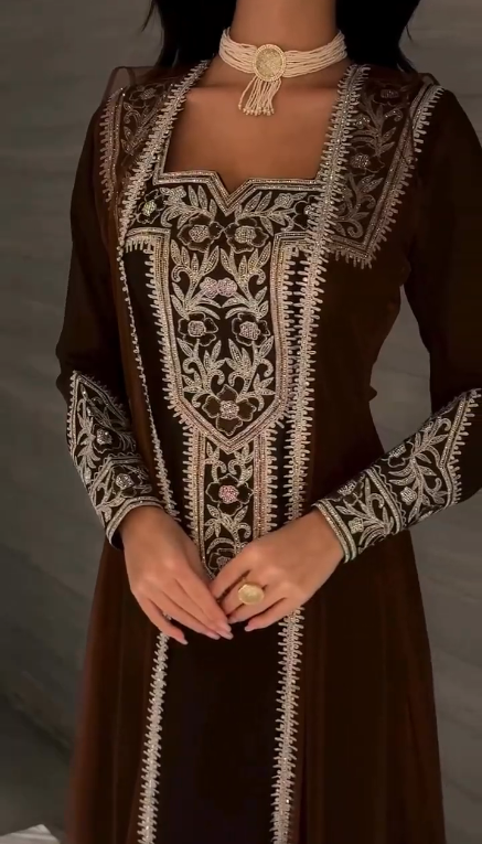 - الخامة: قماش ناعم ومتدفق مع تفاصيل دقيقة