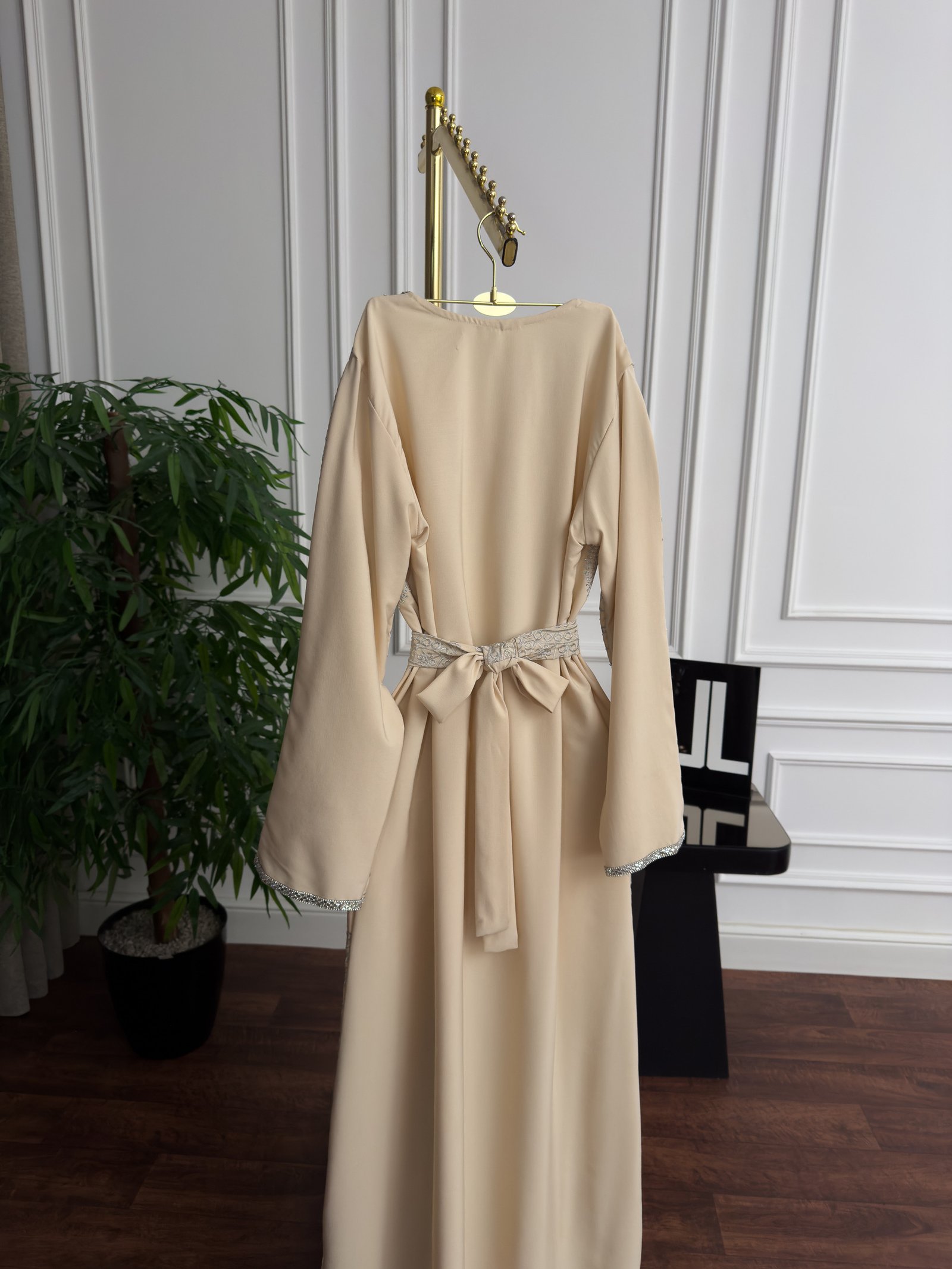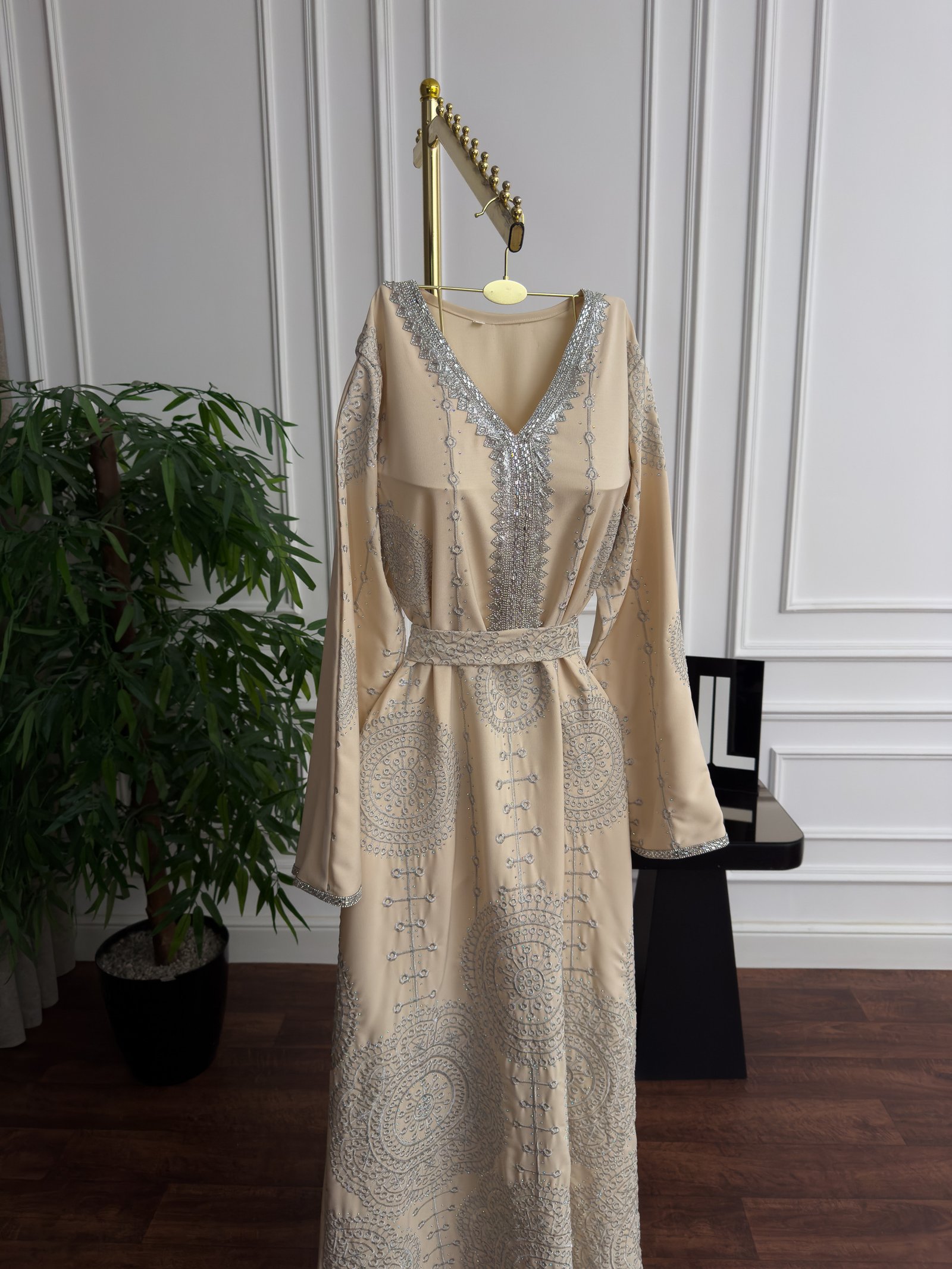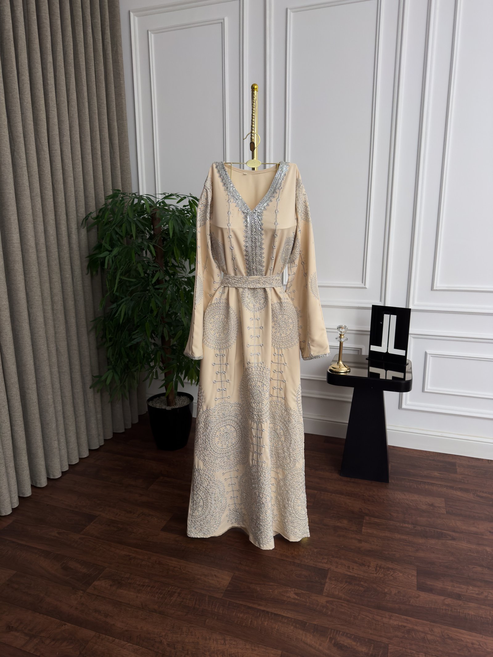 فستان بيج طويل أنيق وفاخر مثالي للسهرات والمناسبات الرمضانية والعيدية. تصميم ماكسي يضفي لمسة كلاسيكية راقية وإطلالة أنثوية فخمة ومريحة في آن واحد.