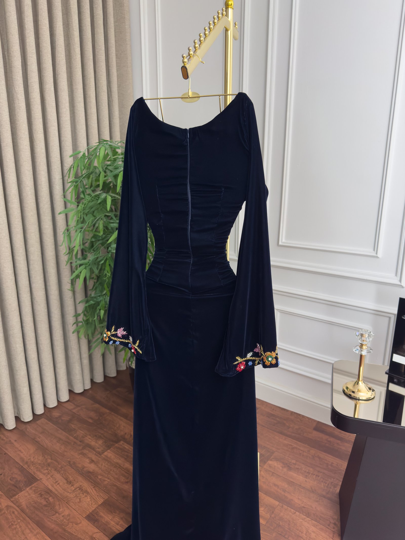 - التصميم: تطريز على الرقبة، الأكمام، وطول الفستان